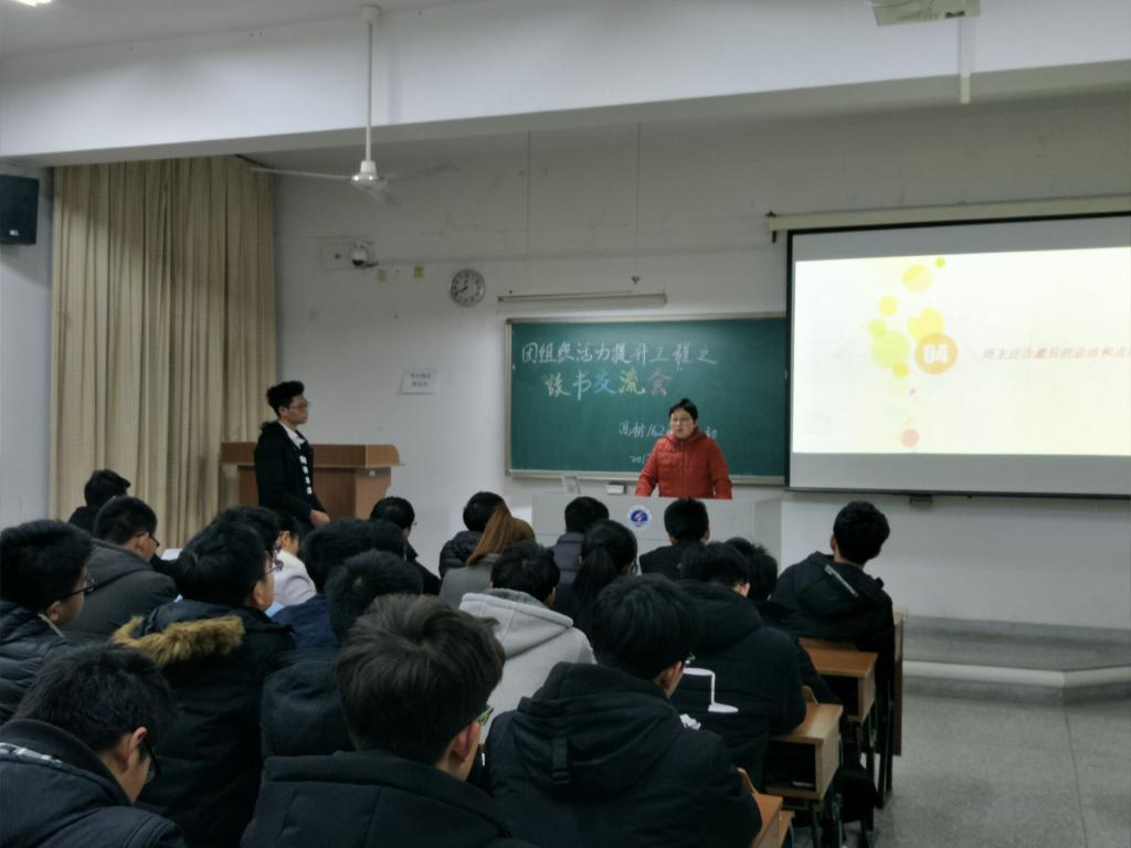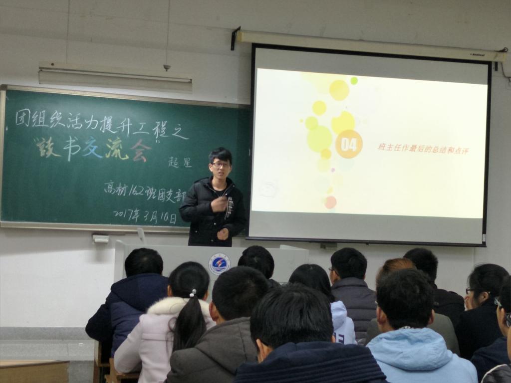 3月10日晚7时许,化学工程公司高分子材料与工程162班于文通楼304室举办了主题为“书香溢满校园,心灵徜徉书海”的读书交流会。班主任李海虹、院团委组织部部长王新出席本次交流会,高材162班全体成员参与,梁晨辉同学担任主讲人。