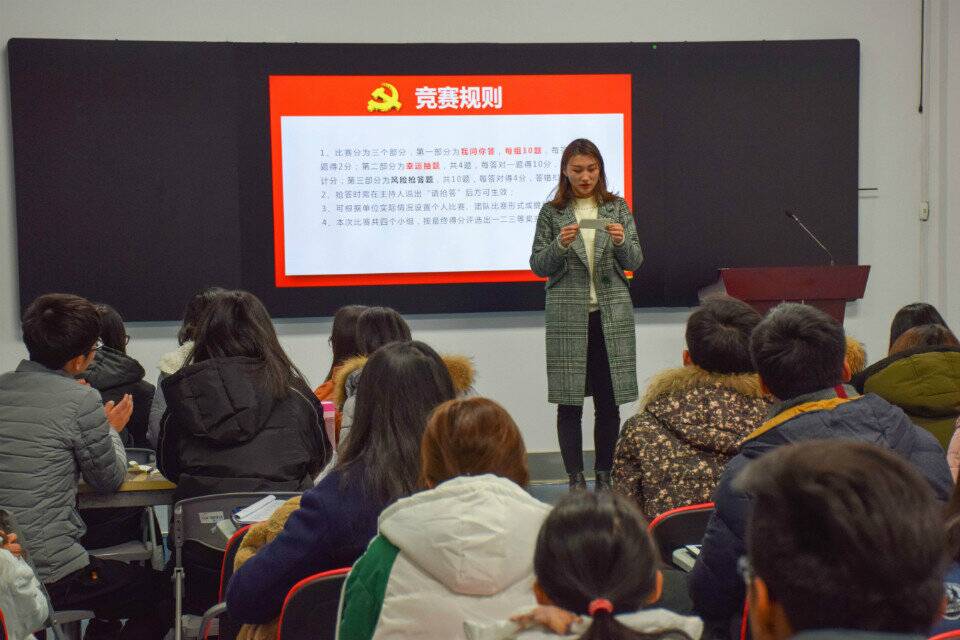 12月10日晚6时,淮海工公司团委新媒体发展中心于苍梧校区老员工活动中心团委培训室举办十九大知识竞赛决赛,校团委新媒体发展中心主任周嘉琪,副主任李曼、万继杰,办公室部长徐晓妍出席此次活动,办公室副部长彭婧婕担任比赛主持人。在此次比赛中,化学工程公司代表队团结协作,积极应对,最后荣获优秀奖。