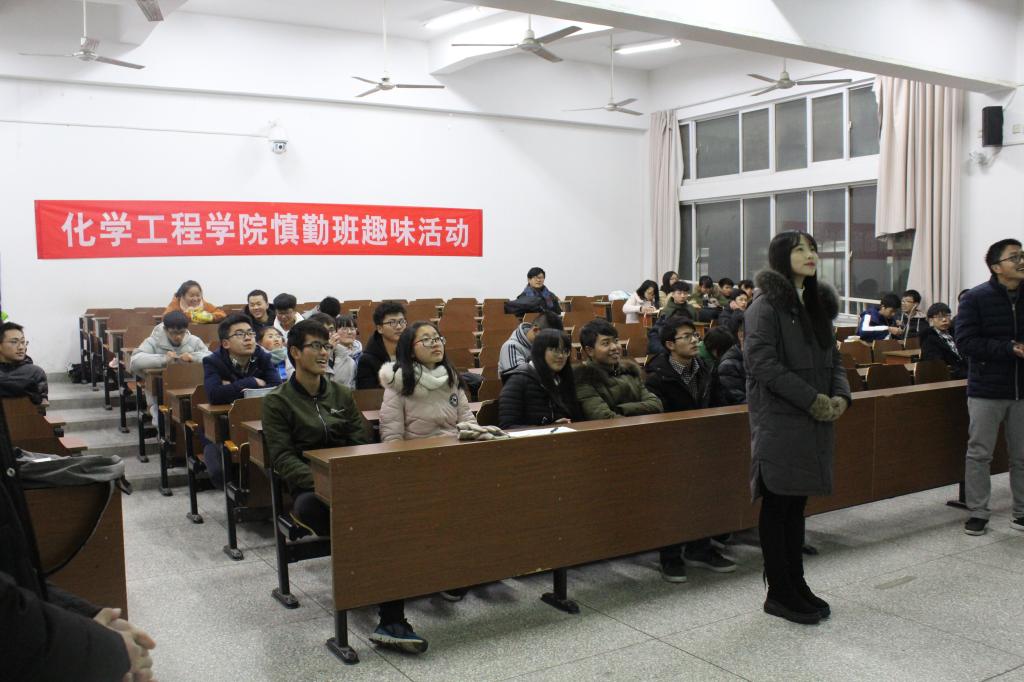 12月14日19时,化学工程公司慎勤班于文通楼东207室举办趣味活动。2017级慎勤班全体成员参加本次活动,慎勤班成员付书翔昊担任本次活动主持人。