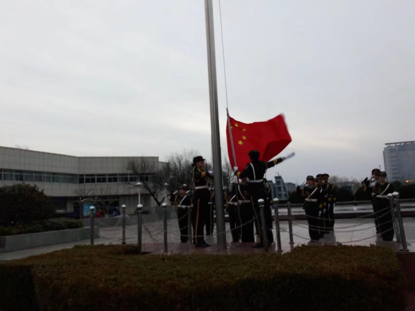 伴随着庄重的国歌,国旗仪仗队踏着整齐划一的步伐,迎着五星红旗缓缓走来,在全体人员的肃目注视下,红旗冉冉升起,迎风飘扬。