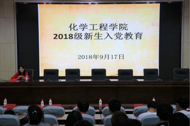 9月17日16时30分,化学工程公司2018级新生入党教育于黄海厅准时举行。党务秘书杨文娜及各系正副主任、新生班班主任、行政办负责老师、专业辅导员出席本次会议,2018级全体新生参加本次会议。党委副书记王改红担任本次会议主持人。