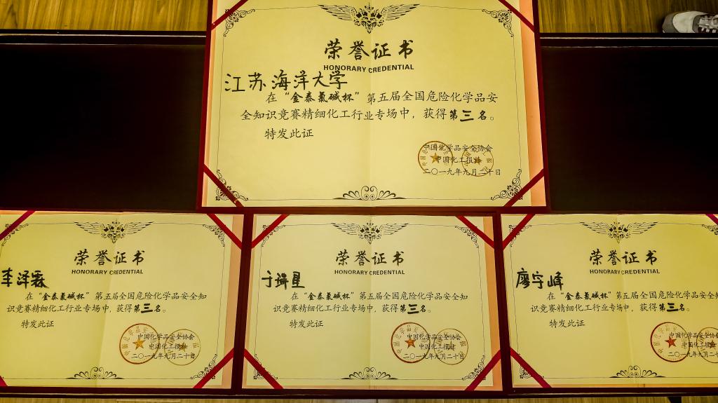 9月19日下午六时,化学工程公司安全工程系张兰君博士带领廖宇峰、李泽霖、于瑞星三位同学赴江苏省新沂市参加“金泰氯碱杯”第五届全国危化品——精细化工专场安全知识竞赛。