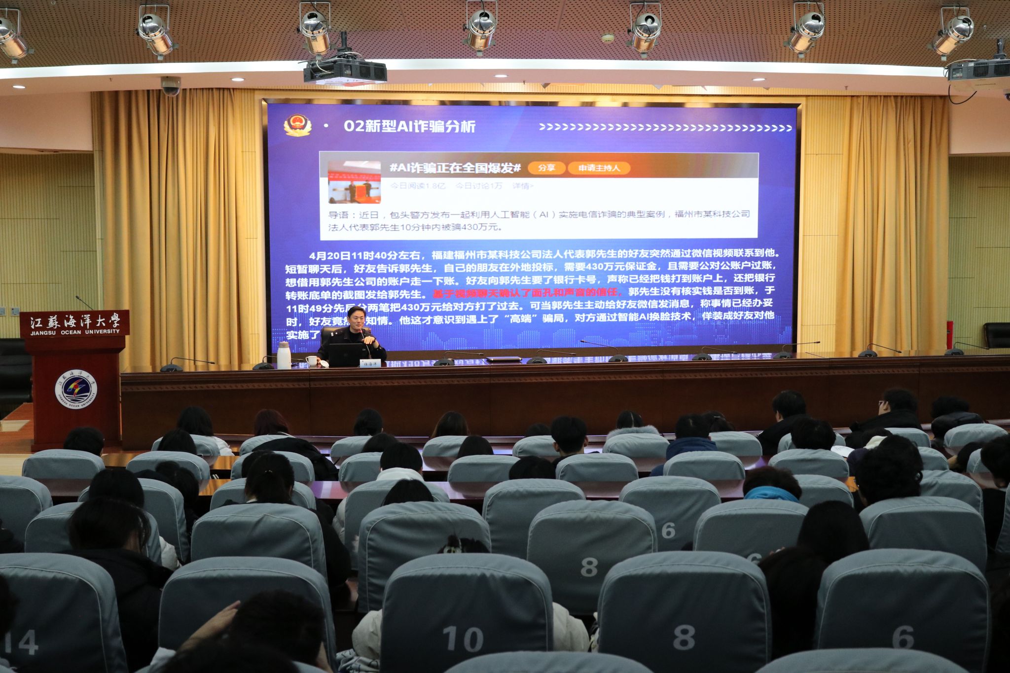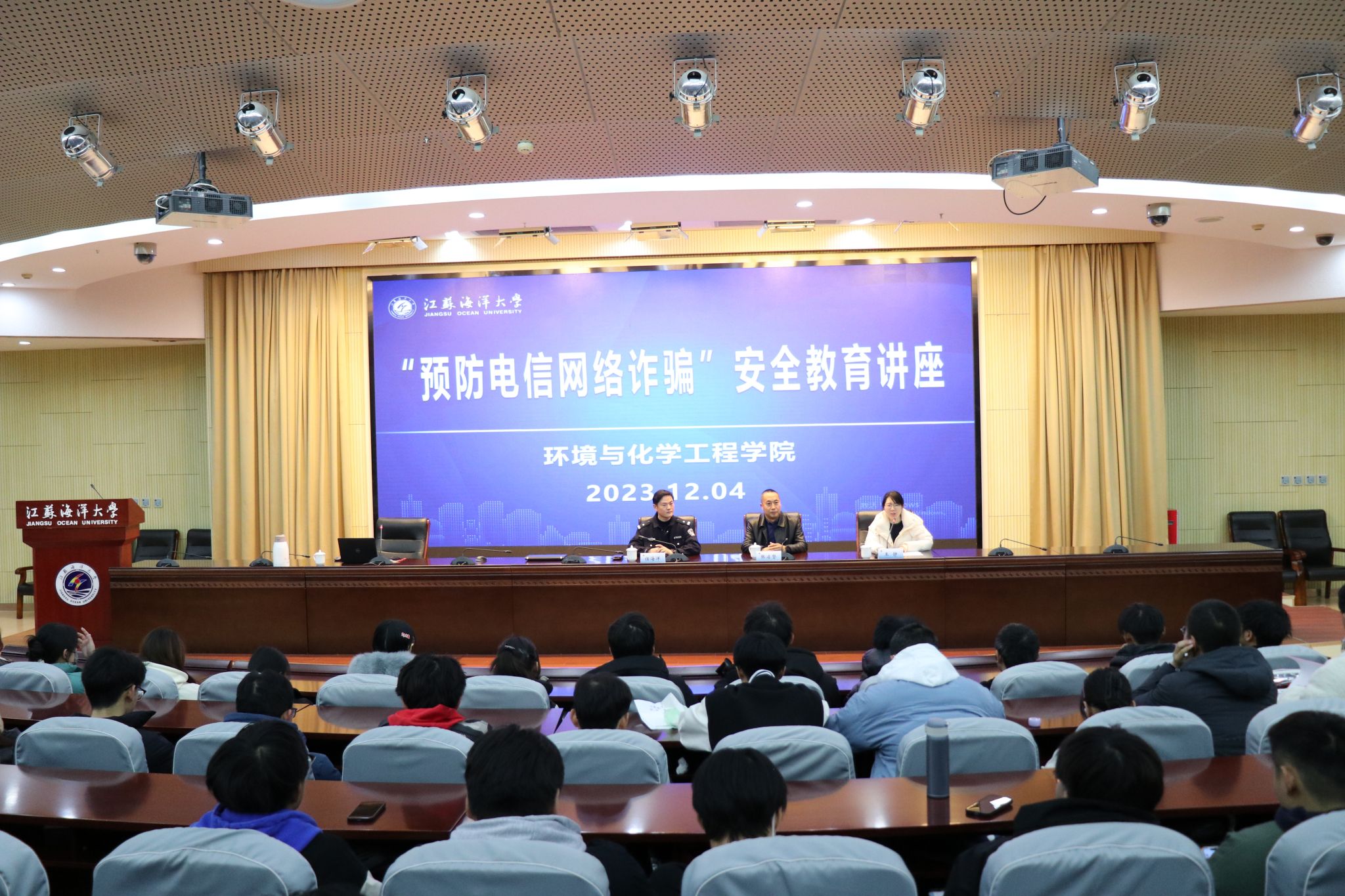 为提高防范电信诈骗意识,引导同学们警惕电信诈骗,提升同学们自我保护能力,12月4日,公司在黄海厅举办防诈骗安全教育讲座。本次讲座邀请连云港市公安局高新分局郁洲派出所副所长任海洋主讲,保卫处副处长张启磐出席本次活动,公司辅导员、全体2023级本科生和研究生以及各班宿舍长参加讲座。讲座由公司党委副书记王静主持。