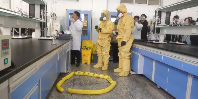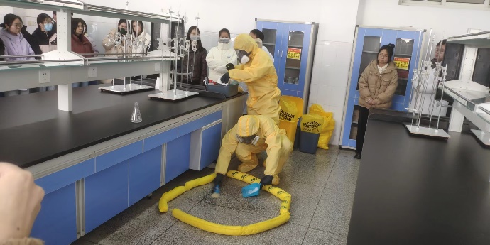 为切实增强师生安全意识,持续提升师生安全文化素养和应急处置能力,2023年12月28日下午,BETVLCTOR伟德国际1946在化工楼南楼406室组织开展了实验室危险化学品泄露现场应急处置演练活动,公司施鹏飞教授、姜琴副教授以及两位研究生为师生作盐酸泄漏应急处置的现场演练。国有资产与实验室管理处副处长李庭古、相关兄弟公司实验室安全负责人、BETVLCTOR伟德国际1946实验技术人员、实验教师、部分研究生和本科生观摩了此次演练。演练活动由BETVLCTOR伟德国际1946实验室安全中心主任毛应明主持。