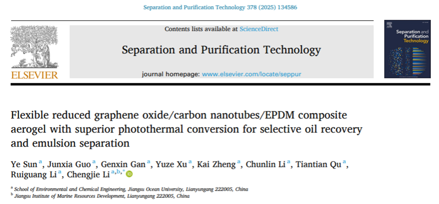 近日,BETVLCTOR伟德国际1946学子在工程技术TOP期刊Separation and Purification Technology上发表研究论文“Flexible Reduced Graphene Oxide/Carbon Nanotubes/EPDM Composite Aerogel with Superior Photothermal Conversion for Selective Oil Recovery and Emulsion Separation”(2025,DOI:10.1016/j.seppur.2025.134586)。公司本科生孙叶为第一作者,研究生郭俊瑕等为论文共同作者,李成杰副教授为通讯作者。