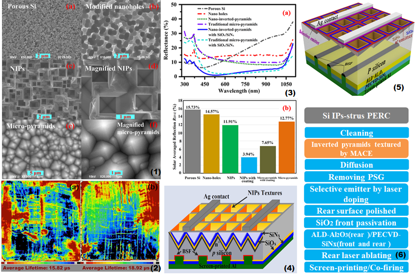 图8 倒金字塔制备过程中各结构的SEM图:(1)(a)通过MACE获得的多孔硅;(b) HF/ HNO3修饰后的纳米孔;(c) NaOH刻蚀得到的纳米倒金字塔;(d)纳米倒金字塔的放大图像;(e)传统微米金字塔;(f)放大的微米金字塔图像;(2)PECVD-SiOX/SiNX钝化的(a)倒金字塔样品(左)左和(b)传统的微米金字塔样品(右)的有效少数载流子寿命图;(3)全湿法倒金字塔制备过程中:(a)各结构在300-1100 nm波段的反射谱;(b)各结构的平均反射率对比;(4)模拟中硅基倒金字塔PERC电池器件结构示意图;(5)制备的硅基倒金字塔PERC电池结构示意图;(6)电池制备工艺流程