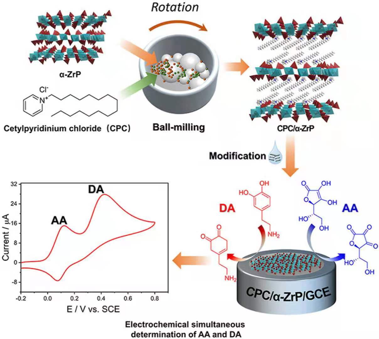 葛雨婷同学以回流法制备的α-ZrP为主体材料,为了避免溶剂对环境的影响,这里采用行星式球磨仪,在无溶剂的条件下将CPC成功研磨进α-ZrP层板间。此外利用多种仪器对该材料的形貌结构进行了表征。之后,将制备的CPC/α-ZrP修饰玻碳电极使用CV和DPV技术同时检测AA和DA。使用CV测试的结果表明,AA和DA在CPC/α-ZrP修饰电极上显示出两个分辨良好的氧化峰,电位差为307 mV。而DPV测试表明,AA和DA在40-1500 μM和13-520 μM浓度范围内,获得的电流和浓度的校准曲线是线性的,从而计算出检出限(S/N=3)分别为10 μM和3.3 μM。此外,优异的重现性、稳定性以及对真实样品的检测结果的可靠性,都该证实了该复合材料的实用价值。相关成果发表在Journal of Alloys and Compounds。