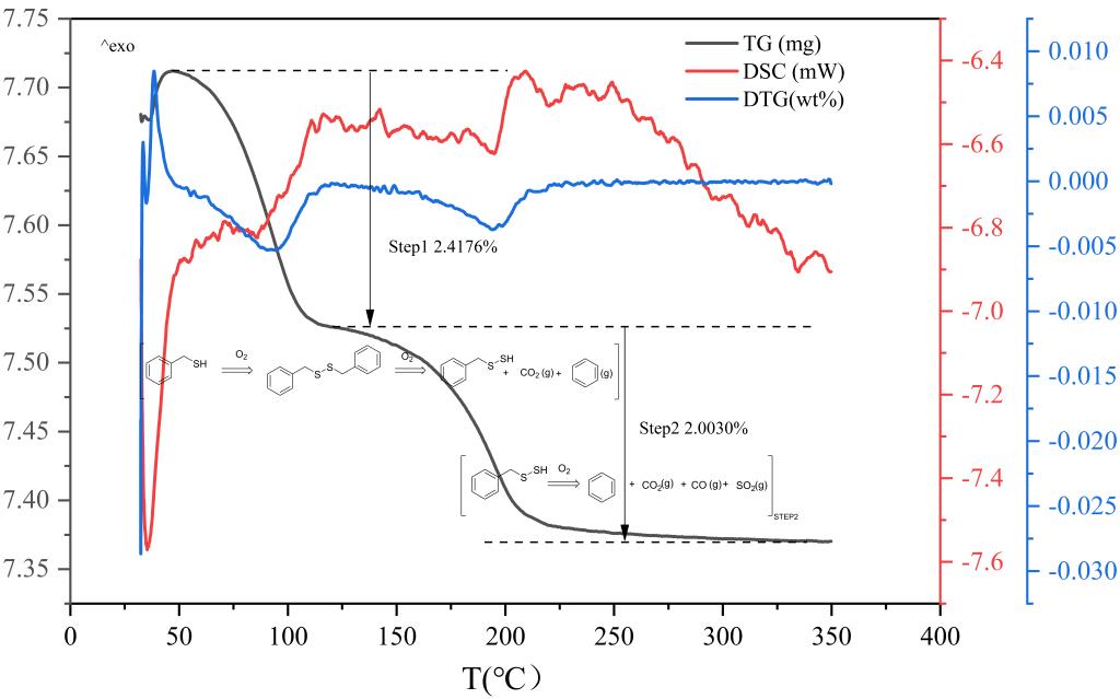 图5 苄基硫醇模型化合物的TG/DTG/DSC曲线