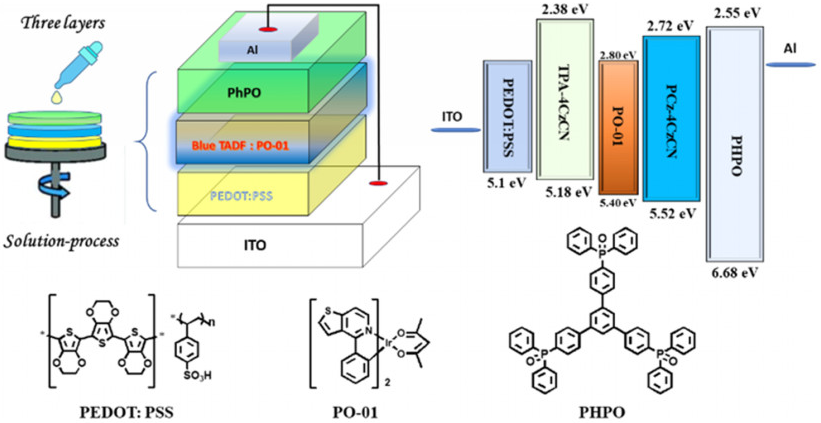 图3 器件结构、能级图和在完全溶液处理OLED中使用的有机化合物的分子结构