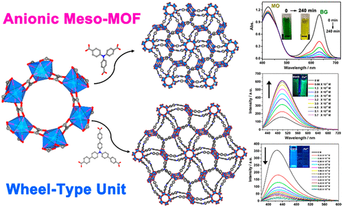 谢阿迪同学先后在Journal of Materials Chemistry C(IF=7.059)和Inorganic Chemistry(IF=4.825)上发表论文。作者以多羧酸配体为基础合成一系列阴离子MOFs,并进行了结构解析和性质的应用研究。此类化合物具有阴离子框架和可调节的窗口大小均可用于吸收和分离阳离子有机染料。利用荧光性质还被开发为多响应式传感器,检测Cu2+、Co2+和Fe3+