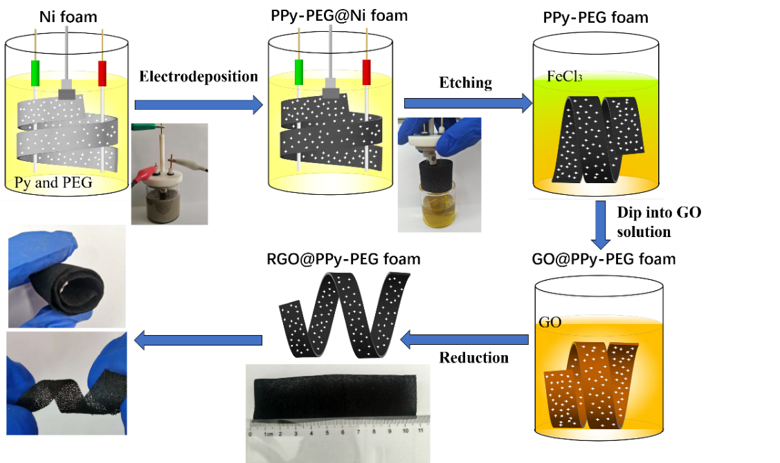 蔡超越同学先后在Materials Letters(259, 2020, 126851)和RSC Advances(10,2020, 29090)上发表论文。作者采用恒电位电沉积方式制得RGO@PPy-PEG泡沫。将RGO@PPy-PEG泡沫用于柔性电极材料,表现出良好的柔韧性、压缩性且具有良好的轻质性能。将RGO@PPy-PEG泡沫作为电极材料,组装成对称型超级电容器,该器件具有优异的机械柔韧性,将三个电容器串联可有效保持5个串联LED灯亮15分钟以上,显示出该材料在实际应用中的巨大潜力。