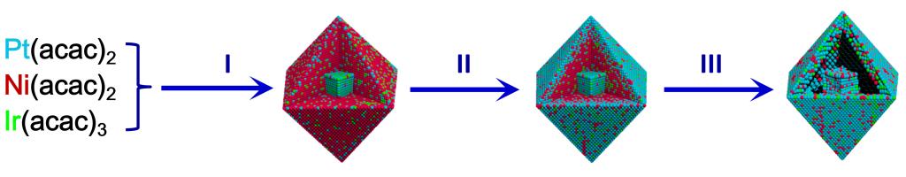 图9 Pt-Ni-Ir核壳和yolk-shell纳米结构的形成过程。(I) Pt、Ni、Ir逐步沉积,在富Pt核上形成富Ni壳层的八面体核壳结构。(II) SLPD法将铂完全沉积在八面体纳米颗粒上。(III)富铂壳与富铂核之间的Ni通过NCE去除,形成了yolk-shell纳米结构。Pt:青色,Ni:红色,Ir:绿色