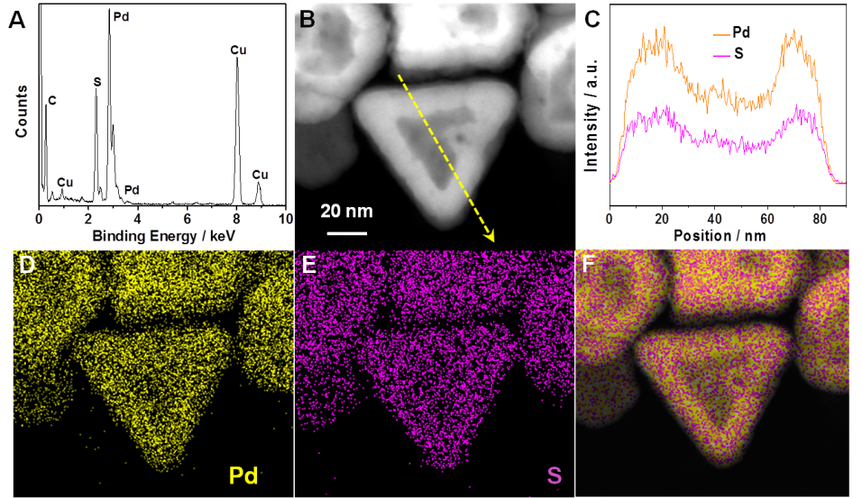 图10 部分非晶态硫化钯纳米片的(A) EDS图谱,(B) HAADF-STEM图像,(C)线性扫描和(D) Pd,(E) S和(F)合并后的元素分布图