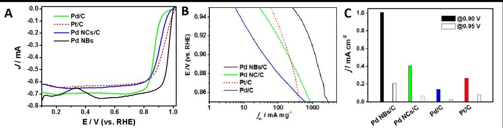 图11 (A)1 M KOH溶液中Pd NBs/C、Pd NCs/C、商业Pd/C和商业Pt/C的ORR电化学性能,1 M KOH溶液中Pd NBs/C、Pd NCs/C、商业Pd/C和商业Pt/C的(B)不同催化剂在0.85-0.95 V的Tafel图,(C)不同催化剂在0.9 V或0.95 V vs. RHE下的比活性