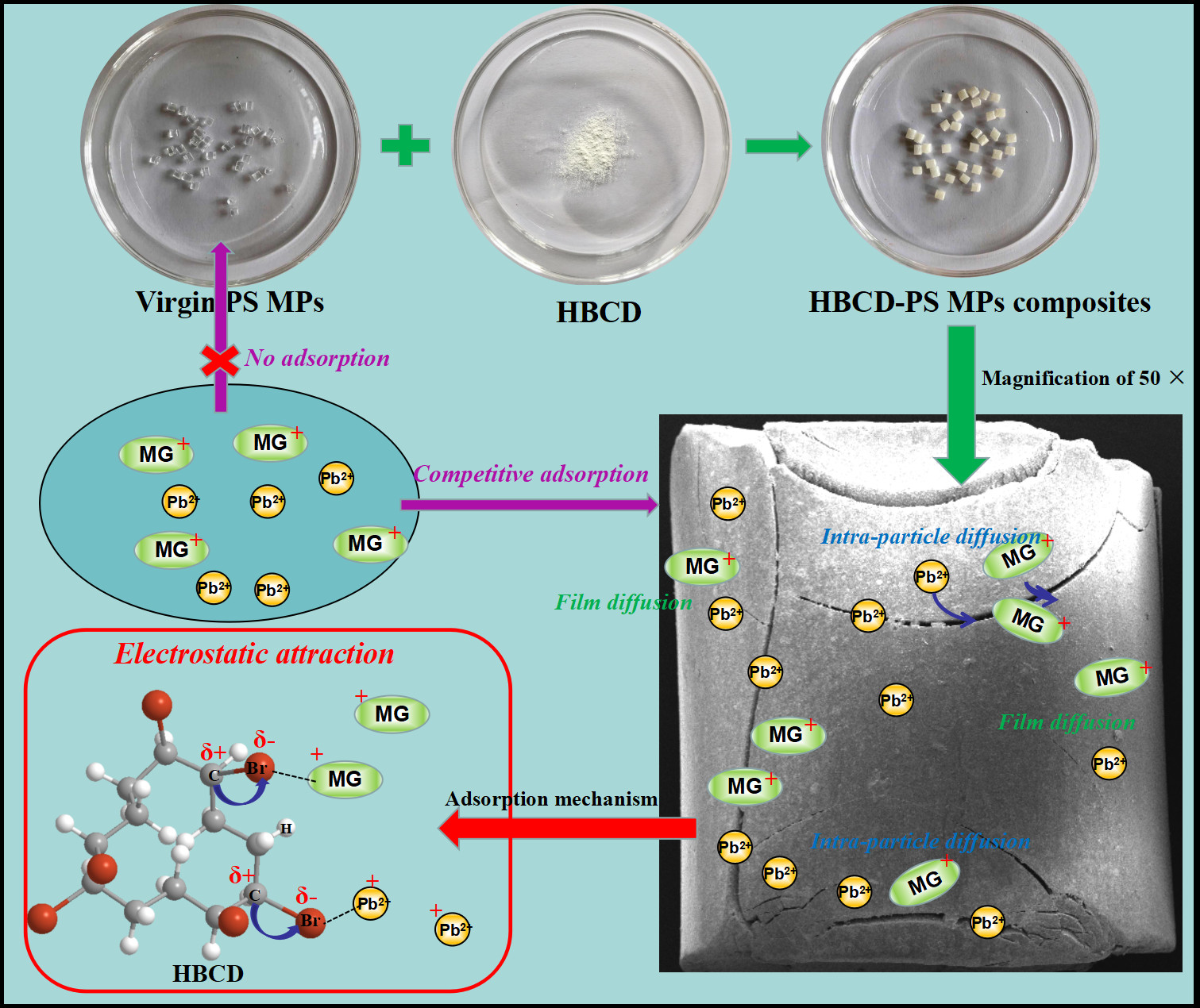 图13 孔雀石绿和金属离子与微塑料结合机理的示意图
