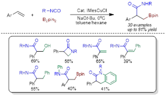 五、应用化学专业研究生苏珍妮使用氮杂环卡宾铜(IMesCuCl)作为催化剂,催化异氰酸酯和联硼酸频那醇酯(B2pin2),对烯烃的硼酰胺化反应,生成系列β-硼基丙酰胺衍生物。反应具有良好的底物耐受性,可兼容多种官能团,如硝基、氰基、卤素等。硼酰胺化可实现克级规模合成,目标产物β-硼基丙酰胺,可通过Suzuki、Ullmann、Mitsunobu等反应,对硼酸酯基和酰胺进一步转化、修饰,从而获得多种重要中间体化合物,如3,4-二氢喹啉-2(H)-酮、β-内酰胺等。鉴于酰胺在药物合成中的重要意义,研究将在药物化学和天然产物合成中有重要应用价值。相关成果发表在Chemical Communication(2020,10.1039/C9CC09902F)期刊上。
