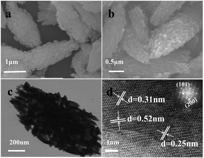 10 (a-b) S-CePO4SEM图像,(c) TEM图像,(d) HR-TEM图像。