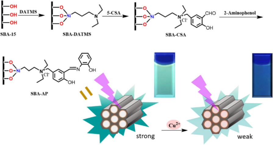 7 有机-无机杂化荧光探针SBA-AP的制备示意图以及在Cu(II)存在下的荧光响应