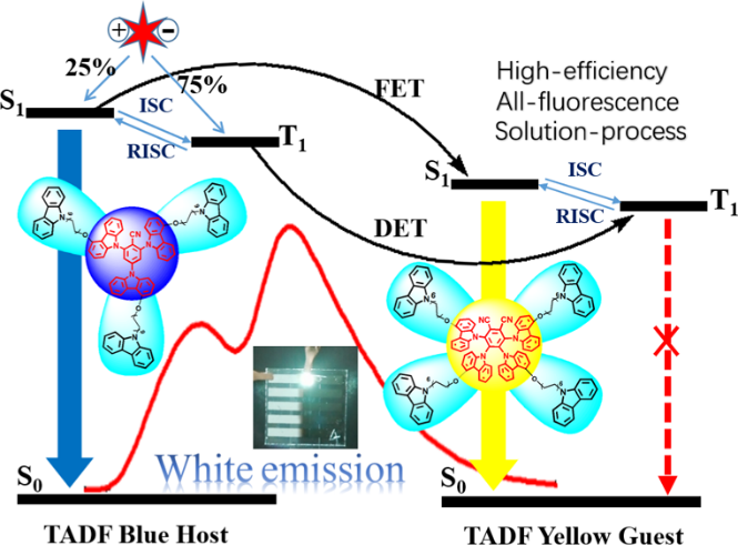 一、应用化学专业研究生陈枫先后在ACS Applied Materials & Interfaces(2019, 10.1039/C8SC05456H)Chemical Science(2018, 10.1021/acsami.8b13101)发表研究论文。作者采用化学封装技术,设计了一类封装型延迟荧光分子,从分子层面上对发光材料进行保护,有效抑制了器件中激子和极化子相互作用引起的光谱红移和浓度猝灭。最终溶液法制备的白色有机发光二极管(WOLED)性能优异,证明了分子封装在降低极性激子猝灭和提高电致发光性能方面的关键作用。
