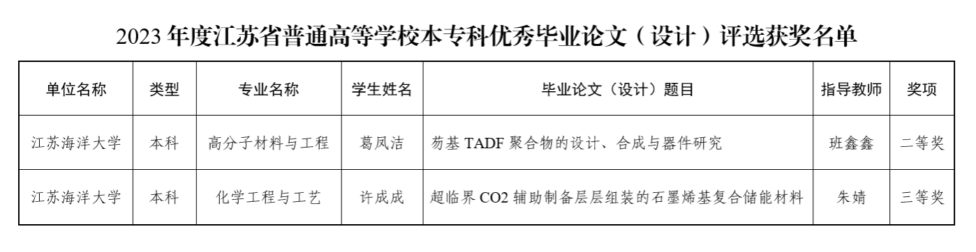 近日,江苏省教育厅公布了2023年度江苏省普通高等公司本专科优秀毕业设计(论文)评选结果,BETVLCTOR伟德国际1946高分子材料与工程专业葛凤洁撰写的论文《芴基TADF聚合物的设计、合成与器件研究》(指导教师:班鑫鑫)获二等奖、化学工程与工艺专业许成成撰写的《超临界CO2辅助制备层层组装的石墨烯基复合储能材料》(指导教师:朱婧)获三等奖。