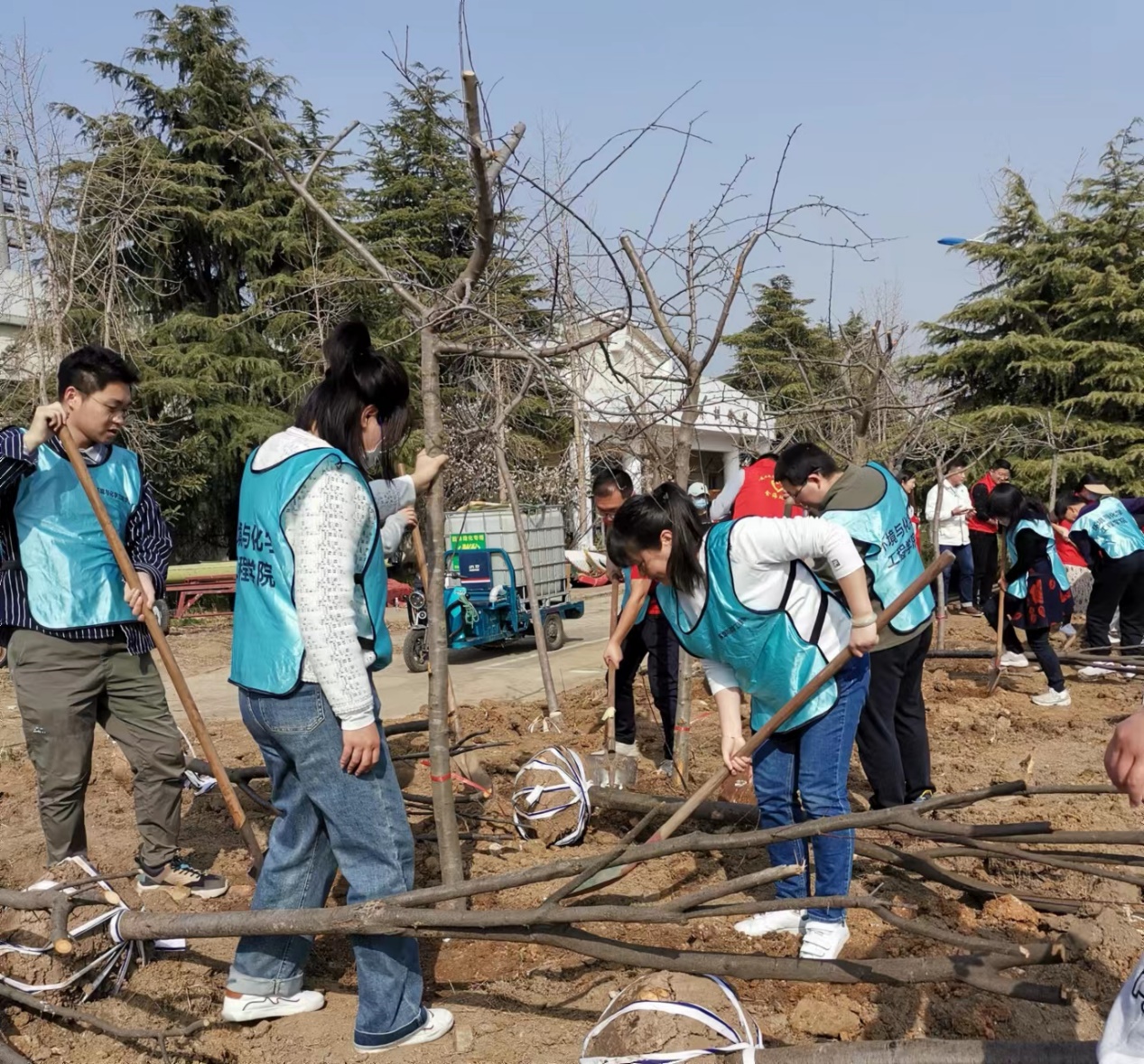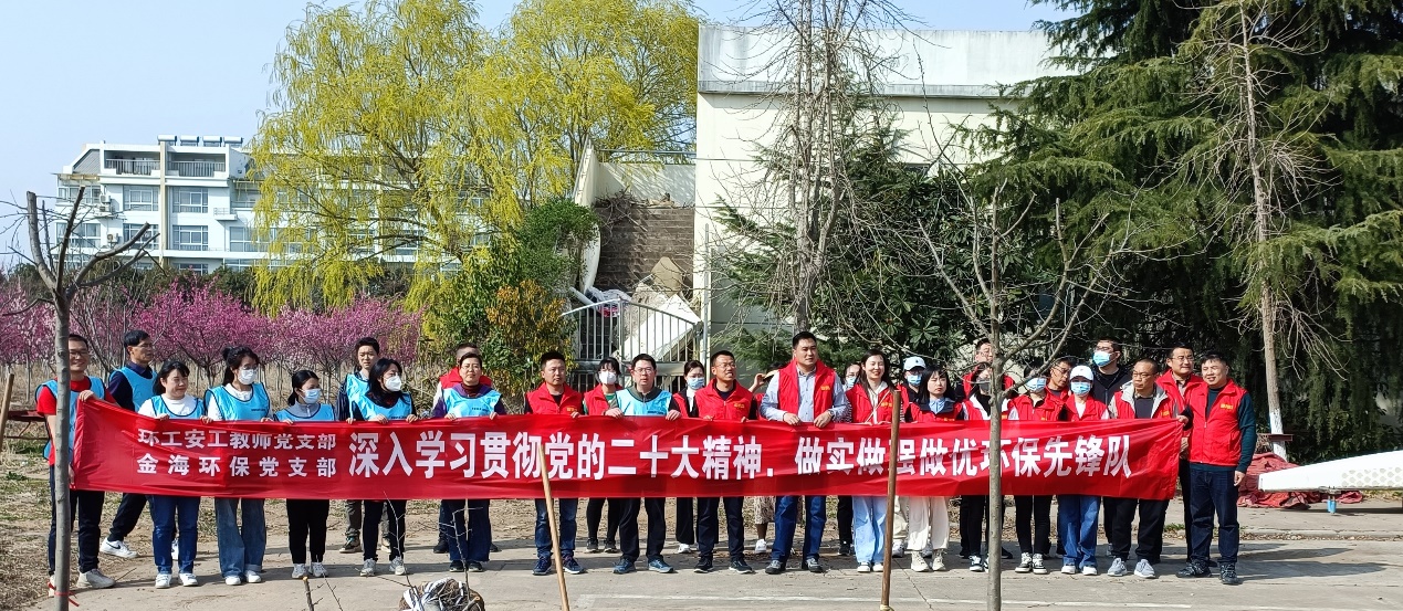 习近平总书记在党的二十大报告中指出,推动绿色发展,促进人与自然和谐共生。必须牢固树立和践行绿水青山就是金山银山的理念,站在人与自然和谐共生的高度谋划发展。为全面贯彻落实党的二十大精神,迎接我国第45个全民义务植树节,3月9日下午,BETVLCTOR伟德国际1946环工安工教师党支部联合连云港市城建控股金海环保党支部,在公司的樱花园旁共同开展了“深入学习贯彻党的二十大精神,做实做强做优环保先锋队”校园植树主题党日活动。