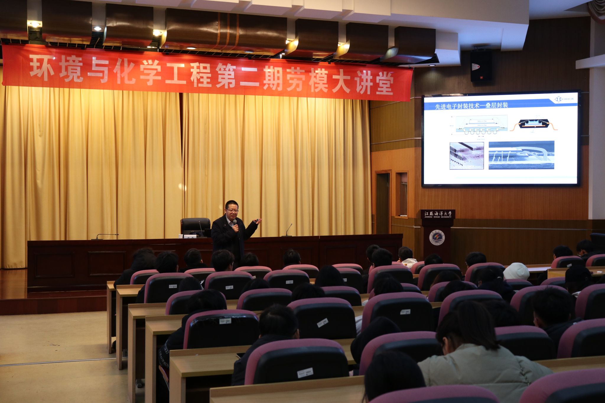 谭伟以《先进封装用国产环氧塑封料的现状与挑战》为题,为在场师生介绍了国产环氧塑封料技术取得的成果和面临的挑战。谭伟在电子封装材料--环氧塑封料领域深耕二十多年,精通环氧塑封料从研发、生产、分析测试及应用全过程。他先后获江苏省十大科技创新成果奖、江苏省五一劳动奖章、市劳动模范、市五一劳动奖章、市科技创新先进个人、市优秀科技人才等荣誉称号。