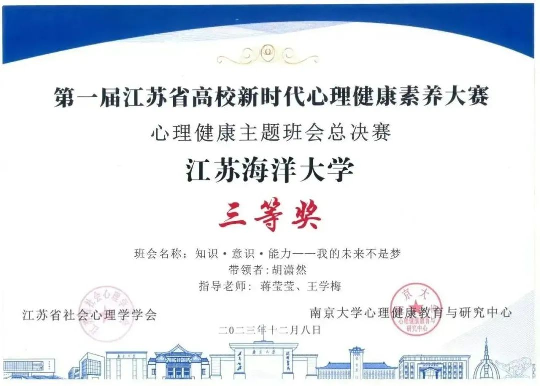 近日,第一届江苏省高校新时代心理健康素养大赛决赛在南京大学举行,大赛由江苏省社会心理学学会、南京大学心理健康教育与研究中心共同主办。在校心理中心指导下,公司心理健康主题班会作品荣获省赛三等奖。
