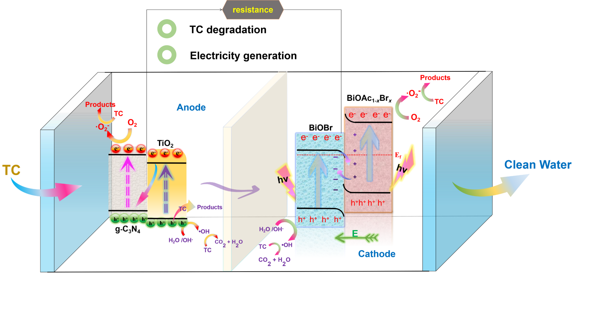 杨冰同学先后在Journal of Materials Science & Technology(中科院1区TOP,IF 10.9,封面文章)及Journal of Materials Chemistry A(中科院2区TOP,IF 11.9)期刊上发表研究论文2篇。通过调控合成S型含氧空位的BiOAc1-xBrx/BiOBr光阴极与Z型TiO2/GO/g-C3N4光阳极,构建光电催化燃料电池装置,研究表明,当Br/Bi的摩尔比为0.8(x=0.8)、pH=2、浓度为60 mg·L-1时,光阴极TC的降解率达到96.33%(120分钟),分别是单一BiOBr和BiOAc的5.29倍和3.76倍。系统电池电压达0.64 V,功率密度为0.71 mW·cm−2,添加少量过硫酸盐对提高导电性有明显效果,探究了光电催化燃料电池中电子的产生、传递与污染物降解机理。利用高效液相色谱质谱分析了TC降解的中间产物,结合密度泛函理论计算探究了TC的最佳降解路径。另外,通过制备S型异质结MoS2-rGO/ZnO与BiOBr/g-C3N4催化剂,与2D网状结构PVDF-HFP复合制备了纳米球复合光催化膜材料,构建了一种新型压电耦合光催化薄膜燃料电池系统。在90分钟内的降解效率分别达93.41%(阴极)与91.46%(阳极),实现了两极污染物的高效去除。压电场效应在两极光催化降解过程中起主导作用,TOC去除率达85.61%。以上研究为S型异质结催化剂在燃料电池中的应用提出了新的方案,为今后构建绿色、稳定、节能的新型催化剂提供了新思路。