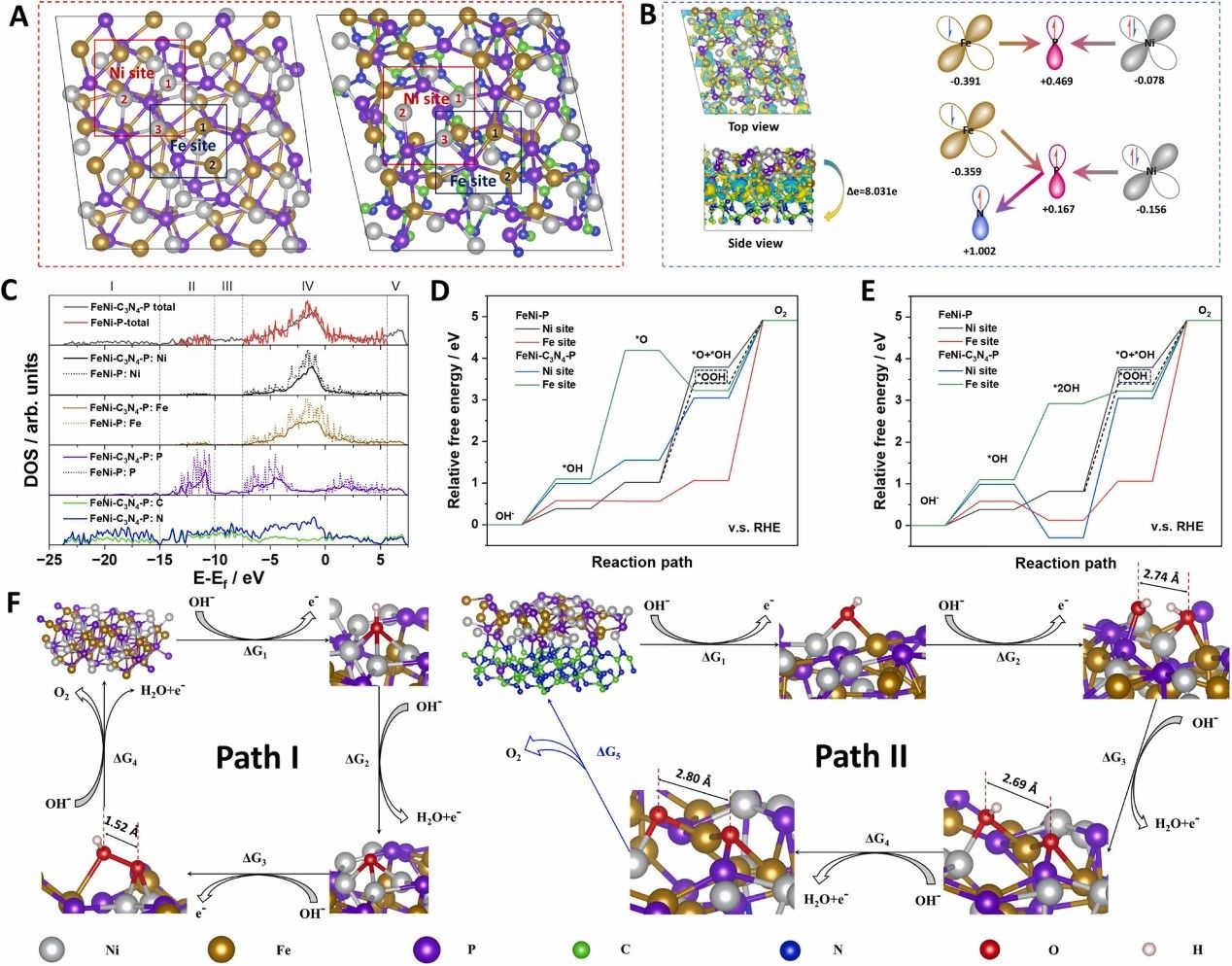 张红艳同学在Applied Catalysis B: Environmental(中科院1区Top期刊,IF=22.1)报道了一种利用碳-氮结构与铁-镍之间形成强p-d轨道杂化作用来提升催化性能的方法。氢气已经成为缓解当前环境污染及能源危机问题的一种理想的清洁、高能源密度、且可再生的新型能源。其中,电解水是一种绿色制氢方法,已经得到广泛认可。电解水制氢的效率在极大程度上取决于所使用的催化剂的性能。过渡金属因其储量丰富和成本低,成为最具有研究和应用前景的催化剂来源。而如何提高过渡金属基催化剂的性能以及稳定性是当前的研究热点。作者在FeNi-P中加入C3N4,使得C3N4中的高电负性N原子吸引金属原子上的电子,从而加强OER中间体在Ni位的吸附。另一方面,C3N4中的N原子通过配位键与Fe原子共享孤对电子,削弱了含氧中间体在Fe位上的吸附,最终提高Ni位点的催化活性,活化Fe位点。电化学测试表明,在碱性环境中该催化剂表现出优异的(Oxygen Evolution Reaction, OER)OER催化活性,只需235 mV的过电位即可实现100 mA cm-2的电流密度,比商用贵金属催化剂IrO2的过电位低49 mV,比RuO2的过电位低88 mV,该催化剂的Tafel斜率也较小,仅为40.4 mV dec-1。并且该催化剂具有优异的催化稳定性和耐久性,在100 mA cm-2的高电流密度下连续工作55 h后,电流密度仅下降3%。这些发现提供了有价值的见解,并为设计高活性的电催化剂提供了有效的策略。