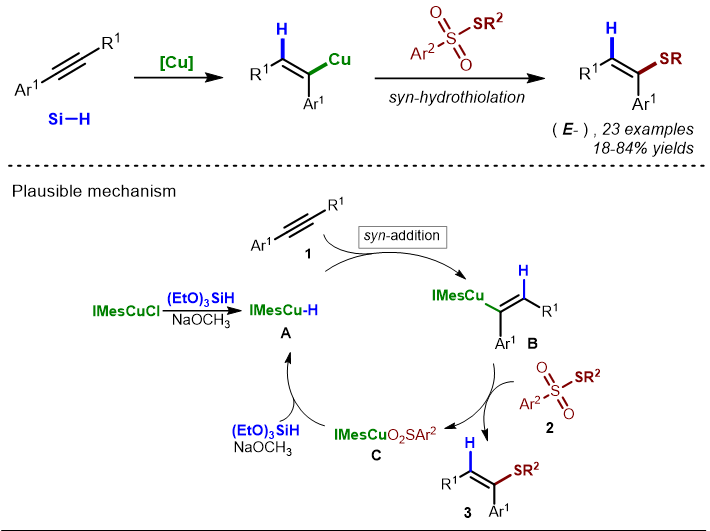高明会同学使用卡宾铜作为催化剂,以稳定、无异味的硫代磺酸酯为亲电性试剂,成功捕获内炔烃生成的烯基铜试剂,实现了(E)-乙烯基硫醚类化合物的高选择性合成,相关研究成果在中科院1区期刊Organic Chemistry Frontiers (IF 5.4)上发表。烯基硫醚广泛应用于合成化学和材料科学,并常见于天然产物、药物和生物活性分子中。与研究较多的末端炔相比,内炔烃硫氢化较少受到关注,主要原因是碳碳三键表现出相对较低的反应活性,并且在加成过程中难以控制区域选择性和立体选择性。在该研究中,作者使用卡宾铜IMesCuCl作为催化剂,三乙氧基硅烷为氢源,使非活化内炔烃生成烯基铜,随后使用稳定、无异味的硫代磺酸酯捕获,成功实现了(E)-乙烯基硫醚的合成。由于铜氢对炔烃是syn加成,催化反应的产物是E式构型,具有高度立体选择性和区域选择性。本研究将在合成化学、药物、天然产物以及材料科学中具有重要意义。