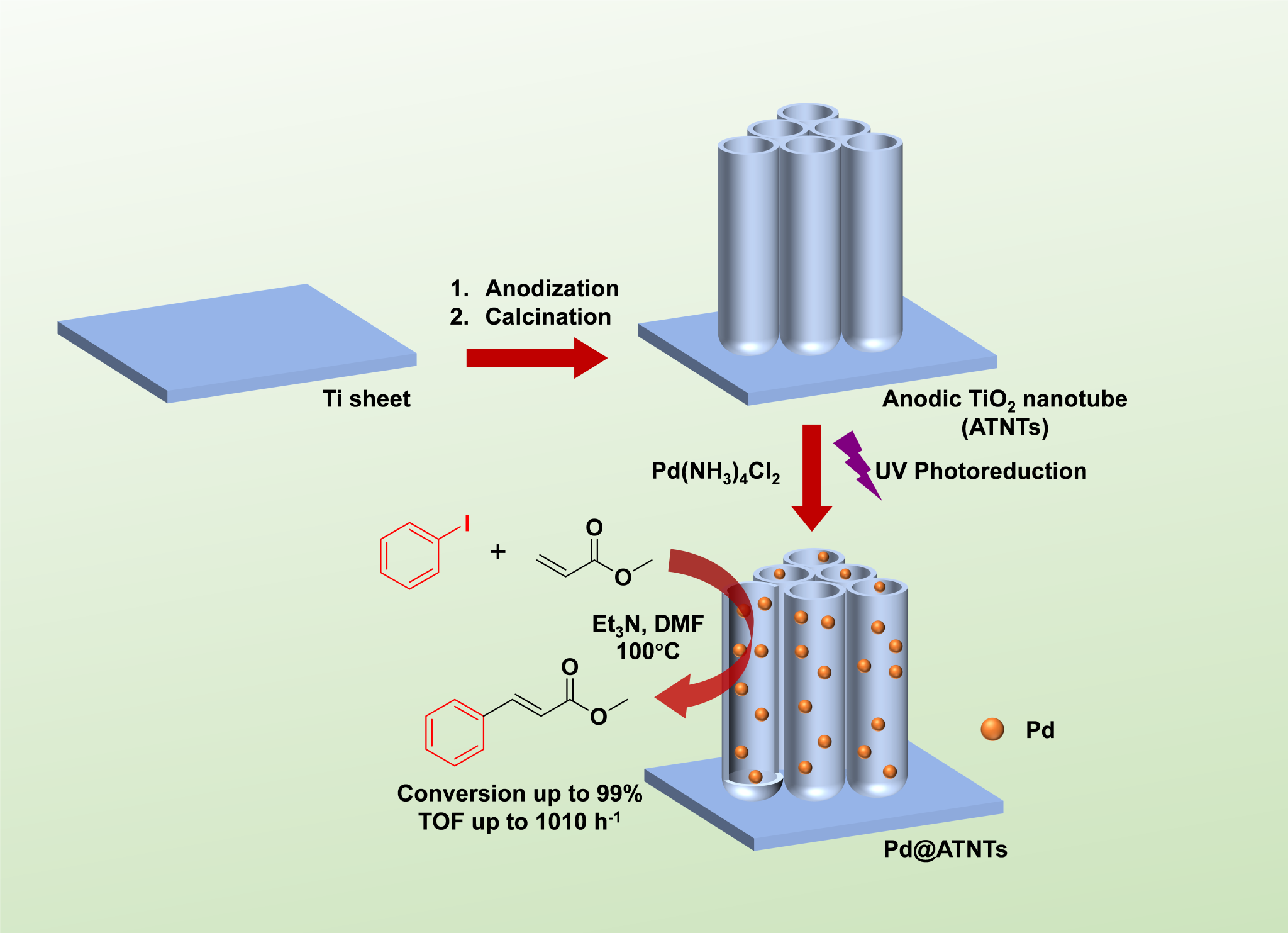 纪翔同学在Molecular Catalysis(中科院二区,影响因子4.6)期刊上报道了一种制备零价钯纳米催化剂的简便方法,及其在各种芳基卤化物与烯烃的Heck偶联反应中的应用。作者以多孔阳极氧化TiO2纳米管(ATNTs)为载体,通过简单的光还原法将平均粒径为8.01 nm Pd纳米颗粒均匀负载于ATNTs的管壁上,制备出了一种新型零价钯纳米催化剂(Pd@ATNTs)。Pd@ATNTs在碘苯和丙烯酸甲酯的Heck偶联反应中呈现出优异的催化活性,30 min内反应转化率可达90.9%,对应的TOF可达1010 h-1。同时,该催化剂普适性好,对一系列芳基卤化物和烯烃均有良好的催化效率。ATNTs的一维结构的限域效应可以减少Pd纳米颗粒的流失,大大提升非均相催化剂的稳定性,Pd@ATNTs循环使用10次后仍能达到92.5%的转化率。