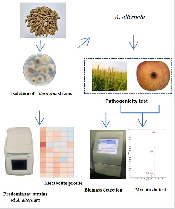乔守宁同学在Plant Pathology(中科院2区期刊,IF 2.7)期刊上报道了从各省小麦籽粒中分离得到282株链格孢菌株,利用ASA10和ASA19两个信息位点进行系统发育分析,结果表明所有菌株均属于链格孢菌(Alternaria alternata),且分离的菌株遗传多样性较低,与地理来源关系不明显;以大米为基质对代表性菌株的次生代谢物进行了评价,大部分菌株都能合成高浓度交链孢毒素(altertoxins-I,ATX-Ⅰ),而交链孢烯(altenuene,ALT)的检出率和含量都低于交链孢酚(alternariol,AOH)及其衍生物交链孢酚单甲醚(alternariol monomethyl ether,AME);在小麦花期喷施链格孢菌的分生孢子后,麦穗上并没有引起明显的症状,但在接种后的籽粒中检测到高浓度的ATX-Ⅰ和链格孢菌的DNA;代表性链格孢菌株离体条件下都能引起苹果果实典型的腐烂症状,并且积累产生四种典型的链格孢毒素。本研究对小麦链格孢菌种群组成进行分析,将为毒理学风险评估和霉菌毒素管理领域提供重要理论基础。