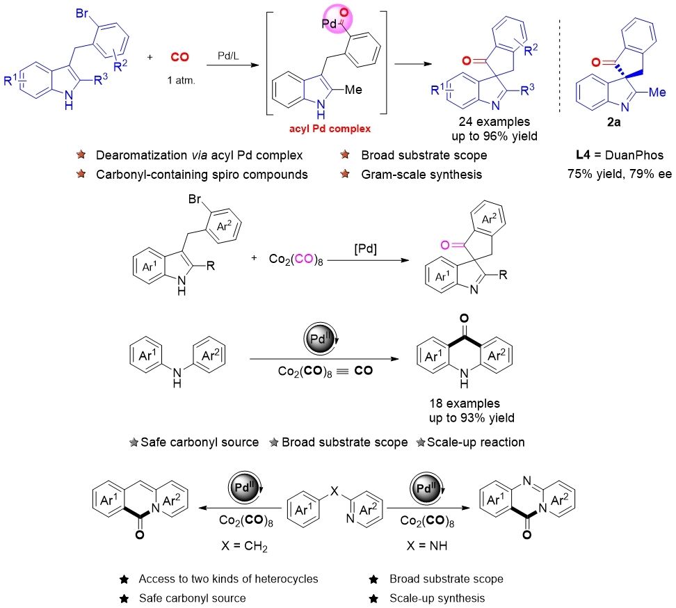 作者首次通过钯催化的一氧化碳插入反应实现吲哚类化合的去芳构化反应,构建一系列重要的含羰全碳季碳螺环分子。同时,对初步进行了不对称尝试,以中等的产率和中等的ee值获得产物。虽然一氧化碳是一种廉价且易得的工业原料,但其具有高毒性和易燃的特点,某些情况下,还需要高压条件,这大大限制其使用范围。于是作者对一氧化碳气体的替代物进行探索,寻找更具安全性、稳定性和易处理的羰基化试剂,最终发现Co2(CO)8是最佳固体羰基化试剂。先后分别通过钯催化的羰基化去芳构化反应构建了含羰基的全碳季碳螺环骨架,通过钯催化二芳基胺双碳氢活化插羰反应构建吖啶酮以及通过钯催化吡啶羰基化环化以构建吡啶异喹啉酮与吡啶喹唑啉酮分子。