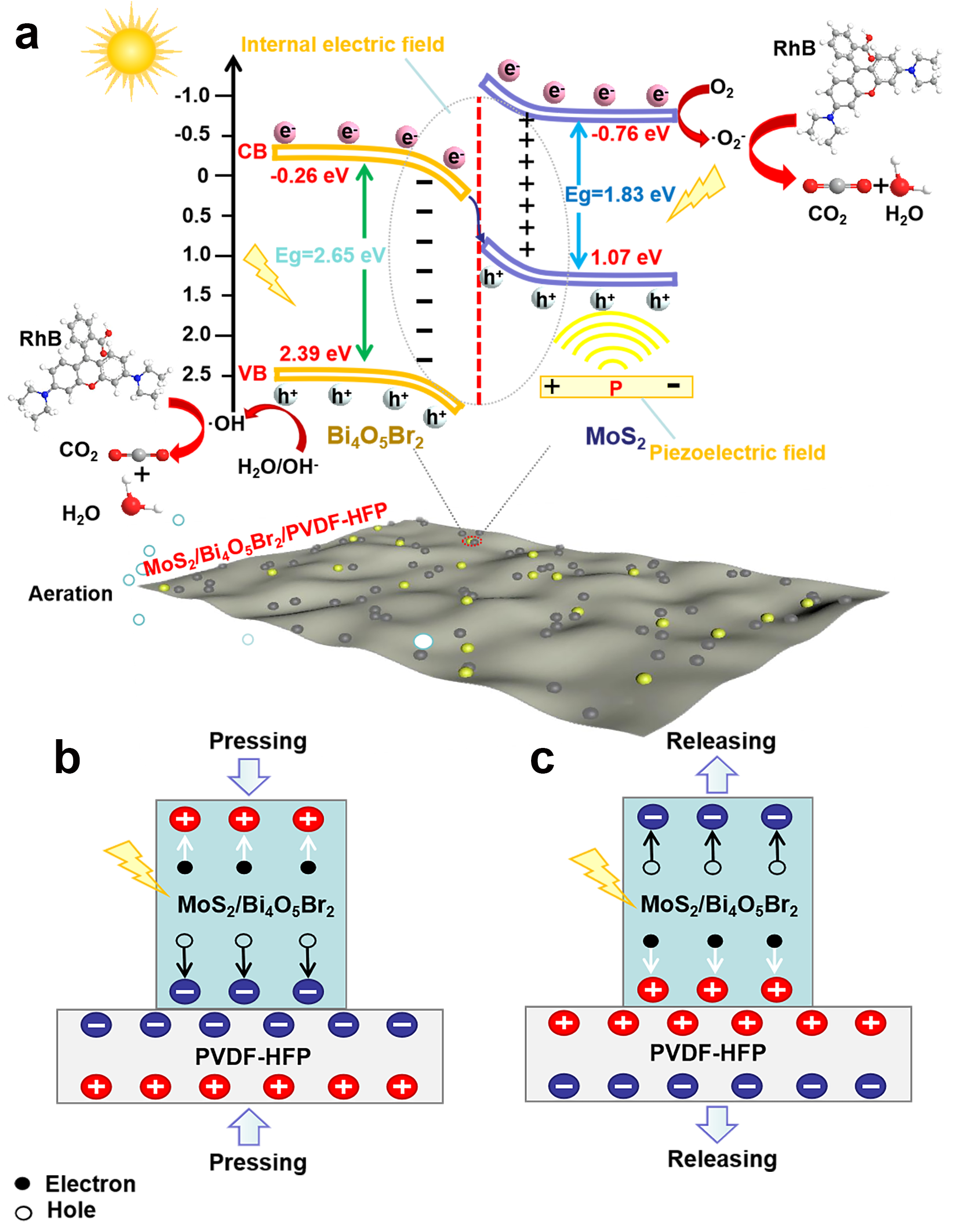 MoS2/Bi4O5Br2/PVDF-HFP膜压电-光催化降解污染物机理示意图