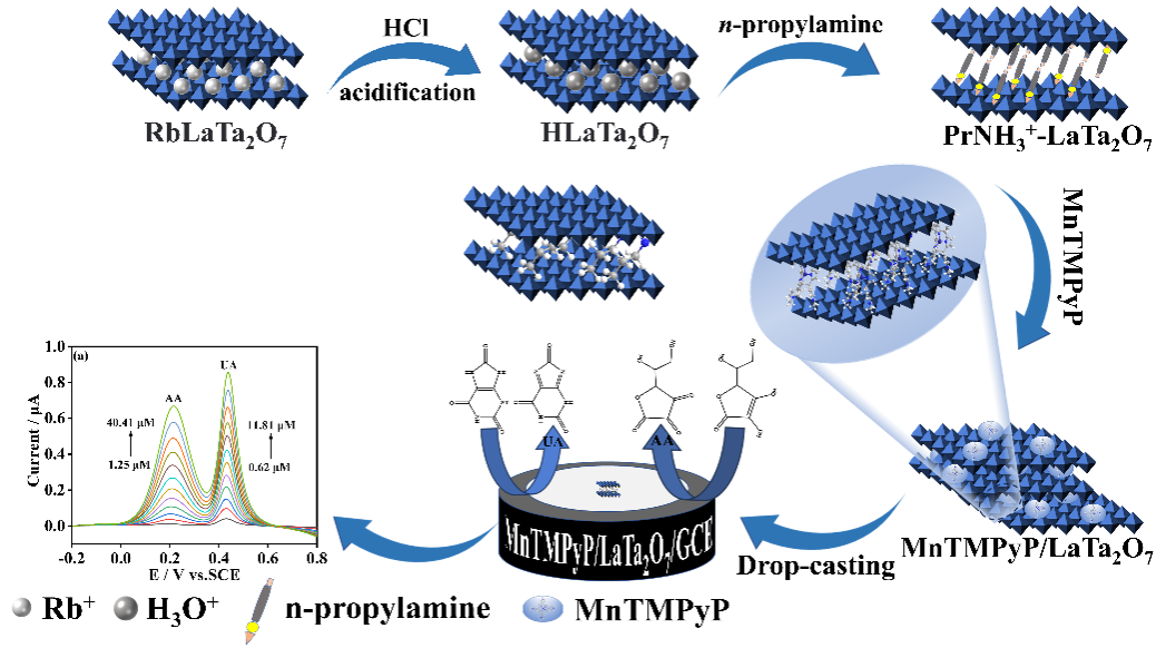 周意成同学在Microchemical Journal(中科院2区期刊,IF 4.8)期刊中报道了一种新型纳米复合材料MnTMPyP/LaTa2O7,用于电化学检测抗坏血酸和尿酸。通过离子交换法将卟啉-锰(III) (MnTMPyP)插入到RbLaTa2O7的层状结构中,合成了纳米复合材料MnTMPyP/LaTa2O7,再探索其在电化学传感器中的应用。MnTMPyP/LaTa2O7/GCE表现出较大的电化学活性面积(0.106 cm2),更小的电化学转移电阻(43.1 Ω),复合后得到的纳米材料的电子转移能力有了很大的提高,对抗坏血酸和尿酸具有良好的电化学氧化性能。此外,MnTMPyP/LaTa2O7/GCE还具有良好的长期稳定性和抗干扰能力。对MnTMPyP/LaTa2O7/GCE进行实际样品分析时,其检测灵敏度和准确度都比较高。