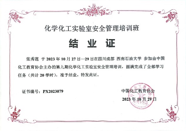 2023年10月27日至30日,由中国化工教育协会主办,西南石油大学(化学化工公司、化学化工国家级实验教学示范中心、油气田应用化学四川省重点实验室、油田化学教育部工程研究中心)承办的第九期化学化工实验室安全管理培训班在四川省成都市顺利召开,来自全国35个单位的100余名代表参加了会议。公司实验中心主任毛应明、基础化学教研室张秀莲等2位老师参加会议。