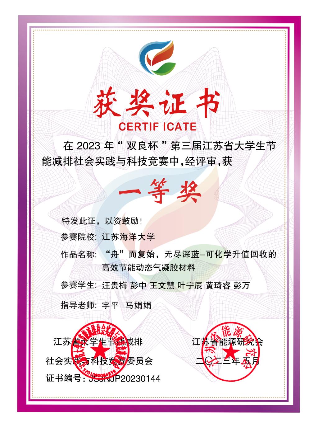 公司由宇平、马娟娟两位老师指导,汪贵梅同学负责的作品《“舟”而复始,无尽深蓝—可化学升值回收的高效节能动态气凝胶材料》荣获一等奖,由夏明、赵新辉两位老师指导,苏朋月同学负责的《一种多应用场景的海洋漂浮垃圾回收装置》和李瑞光老师指导,吕进同学负责的《海洋清洁者—高弹性石墨烯纳米纤维素复合气凝胶》分别荣获二等奖,公司荣获大赛“优秀组织奖”。