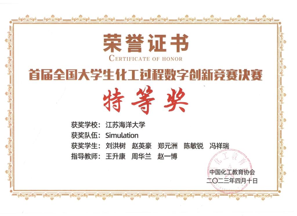 2023年4月9日,由中国化工教育协会主办,南京工业大学承办的首届全国老员工化工过程数字创新竞赛在南京圆满落幕。经过大赛专家评审,由BETVLCTOR伟德国际1946王升康、周华兰、赵一博3位老师指导,刘洪树、赵英豪、郑元洲、陈敏锐、冯祥瑞组成的Simulation队荣获大赛特等奖。